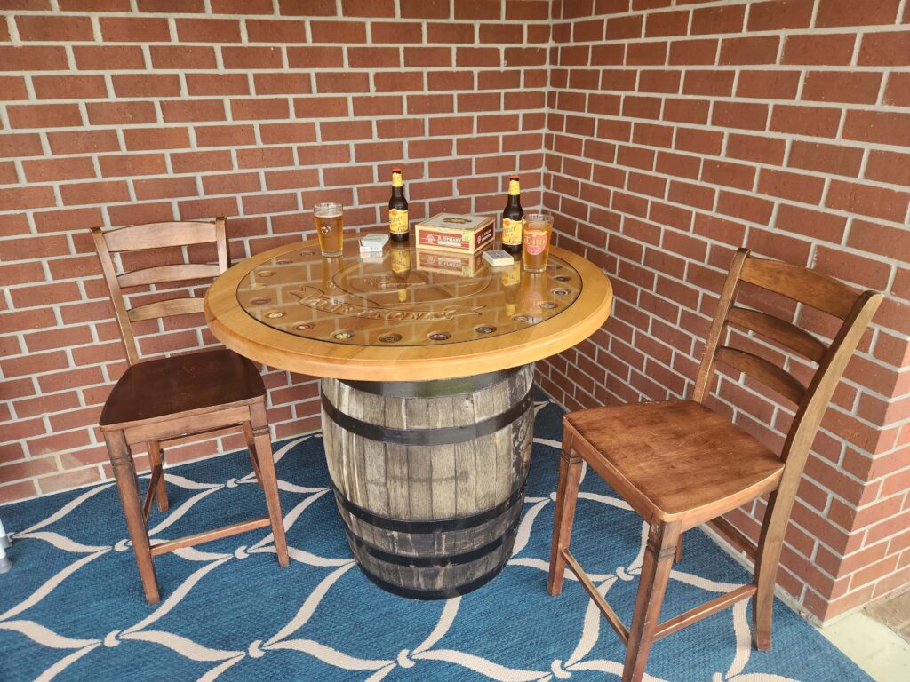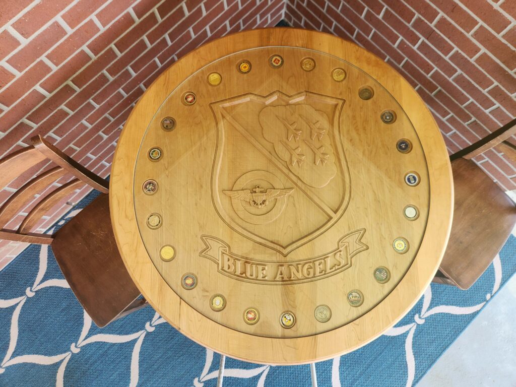 A pub table created for a Blue Angels team member. It is made from Hard Maple though several other wood species are available for tables such as this. Species such as Sapele, a Mahagony, Walnut and Cherry. The table is 42 inches in diameter with a 36 inch glass insert. Challenge coin slots up to 24 are available to be carved.