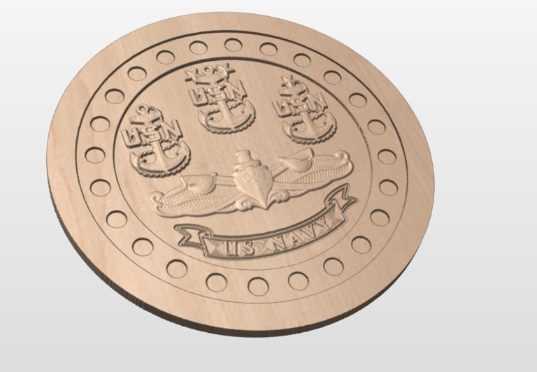 Depicted in the image below are two Naval Aviator Insignia. One is made out of red oak with a gold paint lightly brushed on the surface to give it a unique look. The second insignia is made out of mahogany to give it a more classical appeal. Both are approximately 36″ wide. Let us know if there is anything we can make for you!