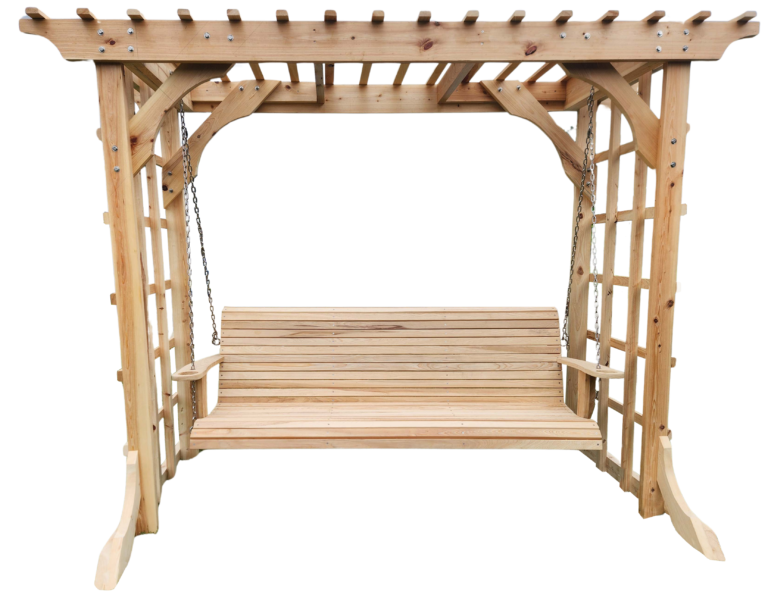 We make custom porch swings with or without stands to your specifications. The depicted swing is 6′ wide in an 8-9′ stand that is approximately 82″ tall. The swing is made from rot-resistant cypress and features a cup holder in each arm. All hardware is stainless steel to minimize corrosion. Give us your specifications and we’ll make a custom design just for you!